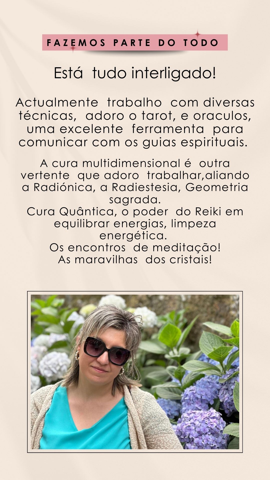 Hoje sou Mestre de Reiki, taróloga, terapeuta holística. Leciono cursos de Reiki, Terapia Angélica, e acompanho processos de cura espiritual através de meditações guiadas, Mesa Radiónica, Numerologia e outras práticas sagradas.